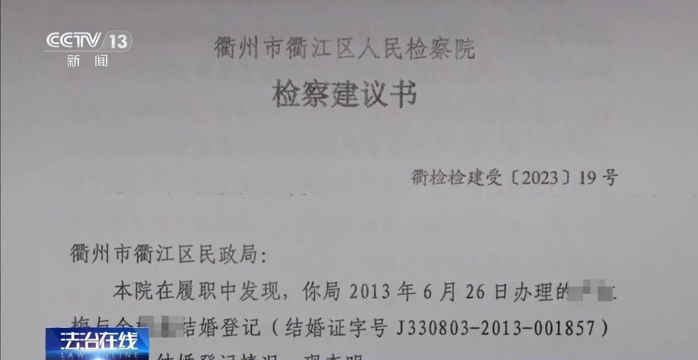 根据调查的结果,衢州市衢江区人民检察院向衢江区民政局制发检察建议,依法督促其撤销小梅和金先生的婚姻登记记录。在收到检察建议后,民政部门迅速撤销了这条婚姻登记记录。衢州市衢江区人民检察院第五检察部主任 蔡灵勇:通过这个案件,我们也跟民政部门建立了一个机制,他们如果有这方面的线索,会同步直接就移送给我们,这其实也是对于这个方式的一个认可,他们也需要我们检察机关去出面去帮助他们解决这方面的问题。